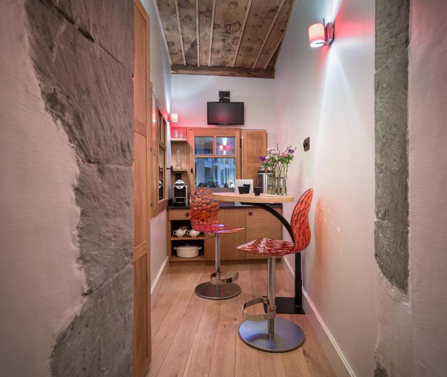 Los volúmenes son generosos y están bien organizados. Cada apartamento dispone de un espacio salón, una cocina completamente equipada y un baño altamente funcional, donde se encuentra un hammam privado. La madera se combina con el metal, el roble se asocia con el nogal, y el conjunto crea una atmósfera cálida que respeta el alma del edificio al tiempo que lo ancla en una modernidad sin excesos. Algunas unidades están diseñadas en dúplex o tríplex, permitiendo configuraciones variadas, ideales para estancias en pareja o escapadas con amigos o en familia.