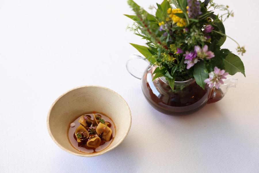 Ici, tout est issu du territoire. Les poissons viennent des lacs voisins, les plantes du jardin ou de producteurs installés à moins de cent kilomètres. Les techniques de cuisson explorent le feu, la lenteur, la simplicité maîtrisée. Chaque assiette se lit comme un poème végétal, où l’omble chevalier croise la feuille de shiso, où les champignons savoyards prennent de la hauteur dans une construction ciselée.