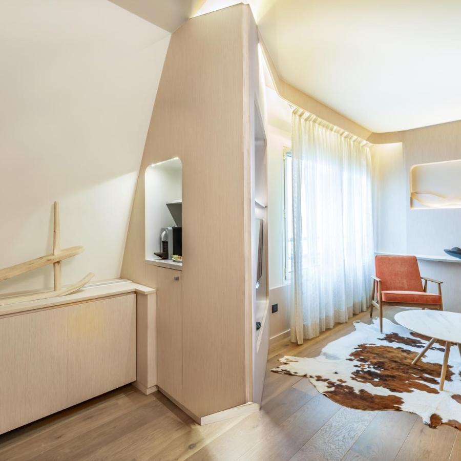 L’atmosphère du lieu se perçoit dès les premières minutes. Derrière la façade contemporaine se cache un intérieur raffiné, où le bois clair côtoie des teintes chaudes et des éclairages étudiés. Le salon, avec sa cheminée, invite à s’installer quelques instants, le temps d’un thé ou d’un rendez-vous improvisé. On s’y sent à l’écart du tumulte, enveloppé dans une bulle douce et feutrée.