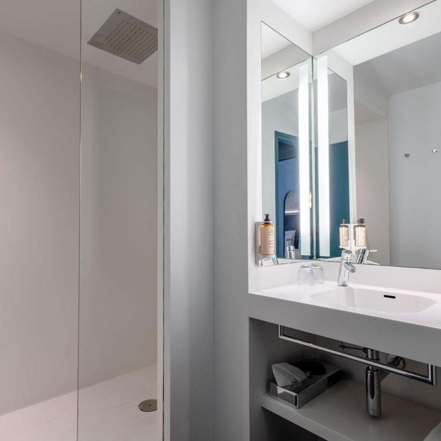 Vous retrouverez dans chaque chambre une literie de qualité, une salle de bain privative avec baignoire ou douche, un mini-bar, un téléviseur écran plat, un coffre-fort et un plateau de courtoisie. Une attention particulière a été portée à l’isolation phonique, offrant une tranquillité bienvenue, y compris dans ce quartier animé en journée.