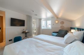 Le camere sono suddivise in diverse categorie, dalla semplice che si affaccia sui vicoli alle più spaziose camere Luxe con vista sui canali o sul castello. Alcune dispongono di un balcone, altre colpiscono per i loro volumi o per la luce naturale. Tutte sono climatizzate e dotate di un vassoio di cortesia con bollitore, una cassaforte, letti di qualità e un televisore a schermo piatto. Alcune possono accogliere una culla o un letto aggiuntivo, offrendo una certa flessibilità a seconda delle esigenze.
