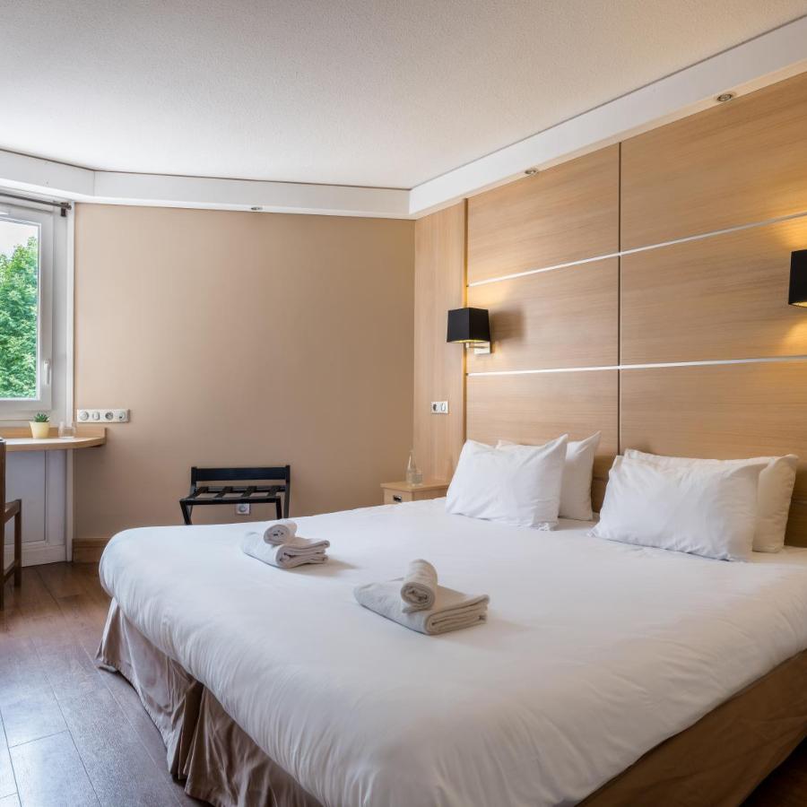 Le sessantotto camere sono pensate per offrire un comfort moderno e funzionale, in un’atmosfera accogliente. Parquet, legno chiaro e tonalità delicate accompagnano una biancheria curata, e tutte le camere sono climatizzate. Alcune sono progettate per accogliere famiglie con bambini, altre sono accessibili alle persone con mobilità ridotta, e tutte godono di un buon isolamento acustico.